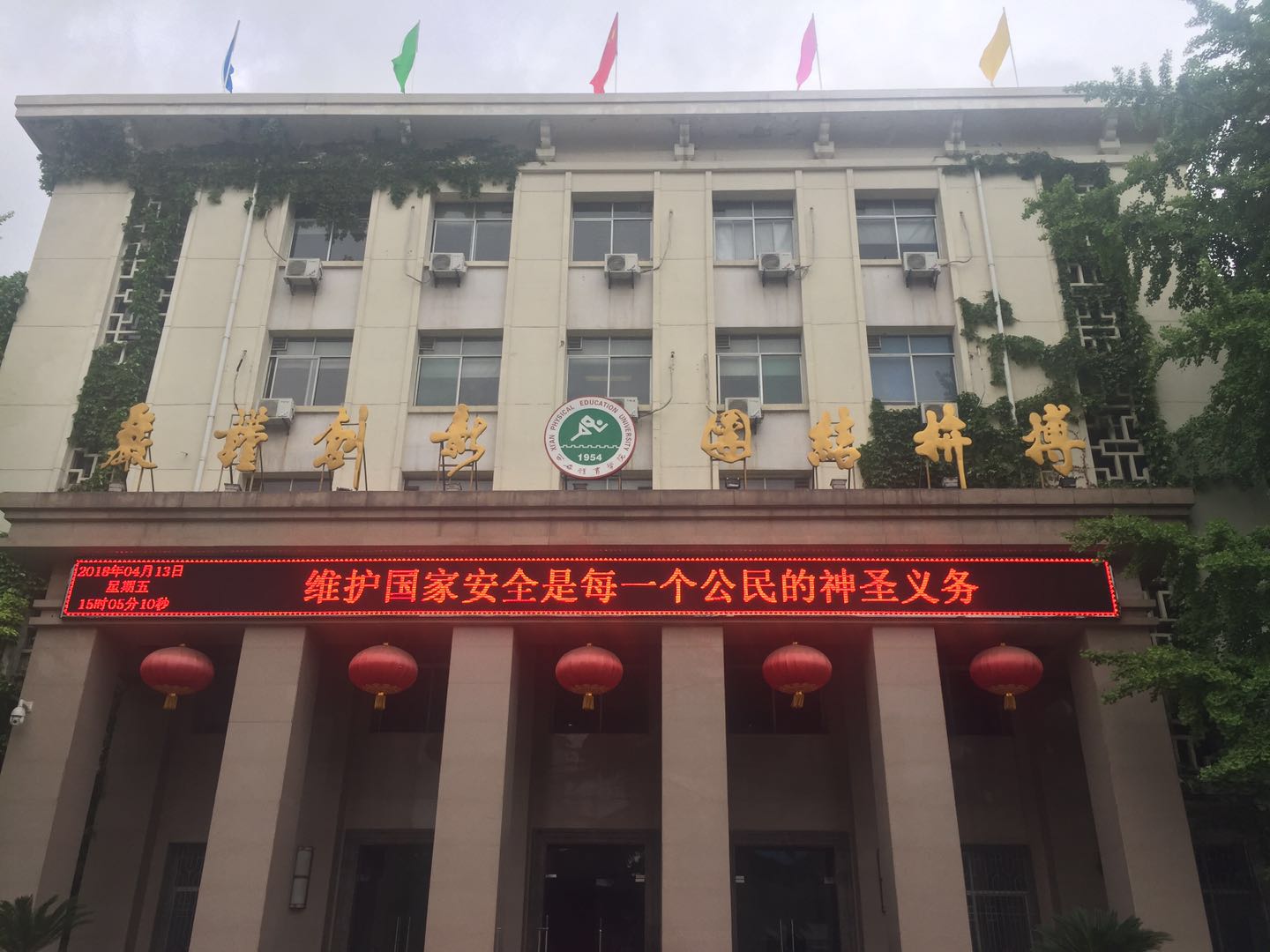1201848日至16日,充分利用学院行政楼、教学楼两处LED显示屏宣传国家安全知识,在校本部及沣峪口校区悬挂国家安全的横幅六条,有力地促进了学生的思想道德修养建设,提高广大师生的国家安全意识。