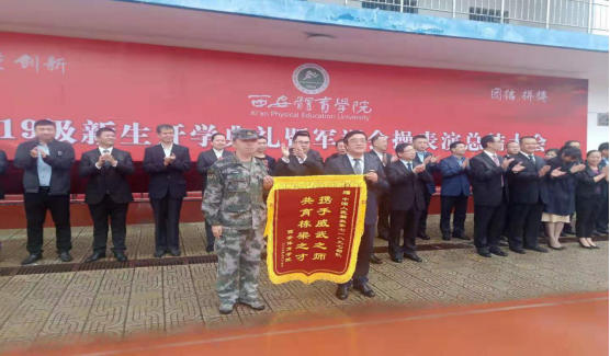 雨势越下越大,学校领导考虑到教官、同学们及工作人员的身体健康,被迫将同学们苦练了十四天的花样队列、军体操等表演科目取消,但表演连队依然强烈要求冒雨表演,展现出西体人不怕苦不怕累的精神。最后各连队通过整齐划一的步伐、嘹亮振奋的口号,斗志昂扬地经过主席台,将十四天的最佳训练成果展现给在场的每一位人。分列式和迎军旗仪式结束后,党委书记黄道峻向承训部队赠送锦旗。副校长陈彦宣读了《关于表彰2019级学生军训先进连队、先进个人、优秀指导员、优秀教官的决定》和军歌比赛获奖连队名单。