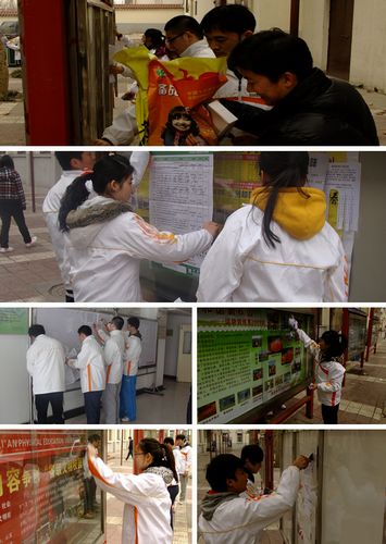 3月5日中午,运动训练系09级部分党员和学生干部在年级辅导员的带领下,还对四号公寓楼和学生食堂周边宣传栏上的无序张贴现象进行了处理。