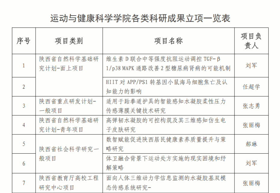 本网讯    截至今年5月,运动与健康科学学院科研工作取得新突破。共获批2025年陕西省重点研发计划或陕西省自然科学基金项目4项、陕西省社会科学研究一般项目2项、陕西省教育厅高校工程研究中心项目1项、陕西省十五运攻关课题6项,累计到账经费近90万元;获批横向课题4项,到账经费约60万元,目前各类科研项目经费总额约150万元。在平台建设方面,获批陕西省高等学校重点实验室1项。科普著作《12周癌症康复管理:营养运动心理》入选国家卫生健康委、科技部、国家中医药局、国家疾控局、中国科协共同组织的“健康知识普及行动—2024年新时代健康科普作品征集大赛”作品名单。