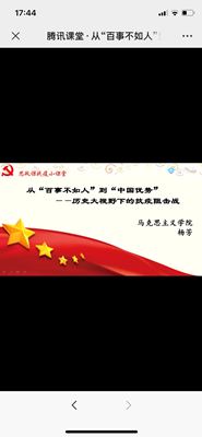 马克思主义学院副院长杨芳博士通过腾讯课堂,以从《“百事不如人”到“中国优势” ——历史大视野下的抗疫阻击战》为题和全校大学生一起分享了她对抗击新冠肺炎疫情阻击战的认识。
