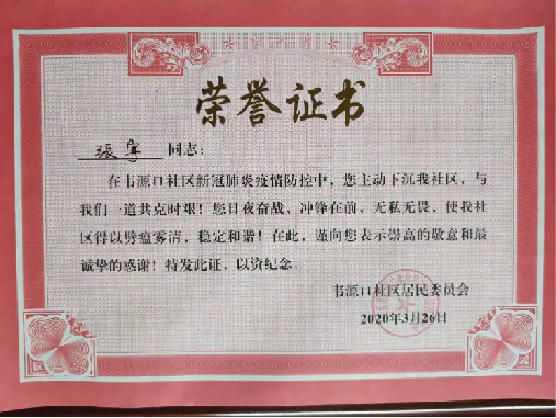 张宇于疫情期间担任湖北省黄石市阳新县韦源口镇送餐志愿者和街道巡逻员、劝导员。送至党员值班卡点,返乡人员隔离区点,确诊患者医院点,一日四顿、56天风雨兼程,共骑行1500公里。于封城时期对小镇进行巡逻并对外出居民科普疫情知识,科普戴口罩。展现西体学子奋发图强,报效祖国的风采。献礼疫情,尽心尽力。