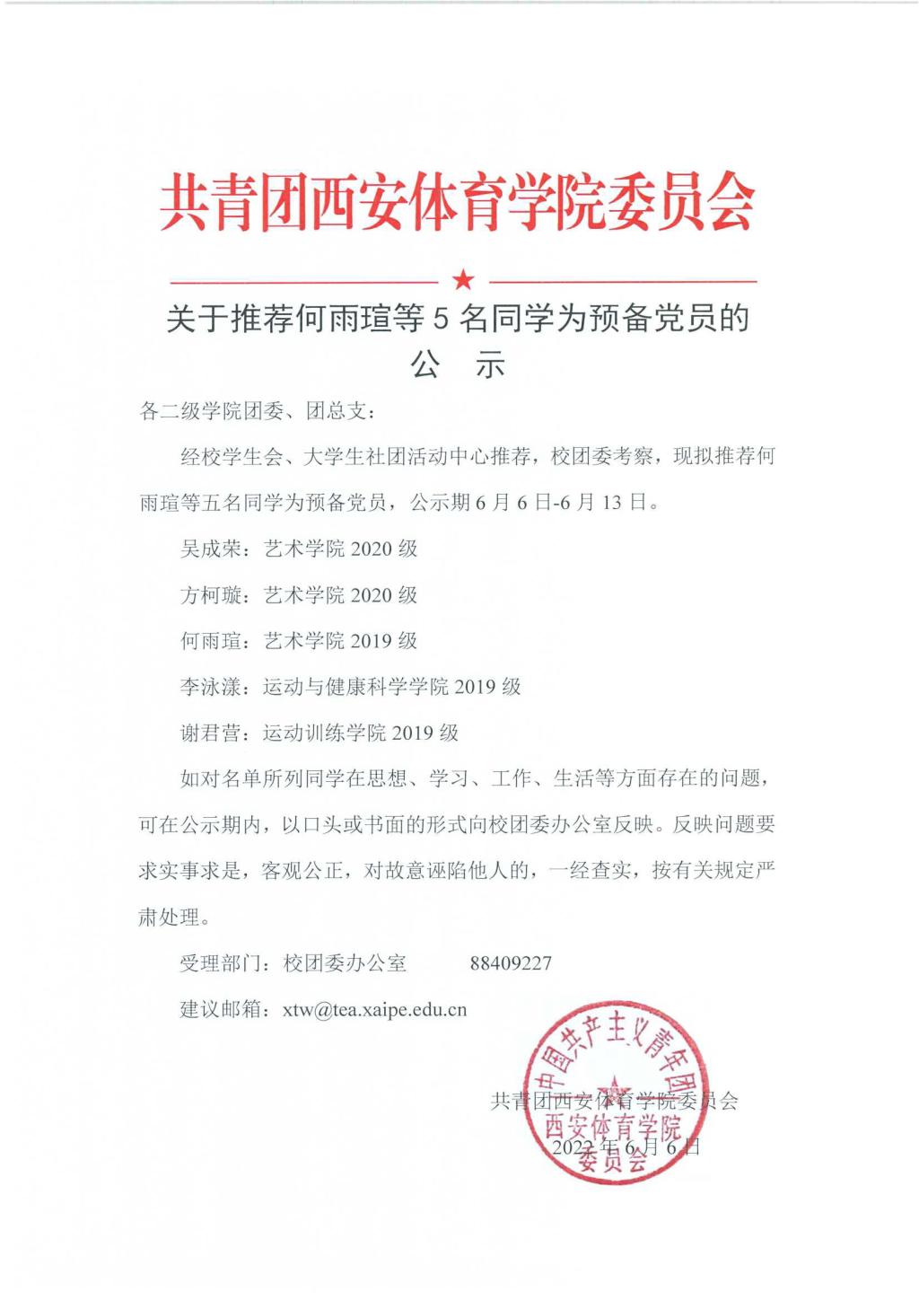 关于推荐何雨瑄等5名同学为预备党员的公示-共青团久久不卡区委员会,久久不卡区