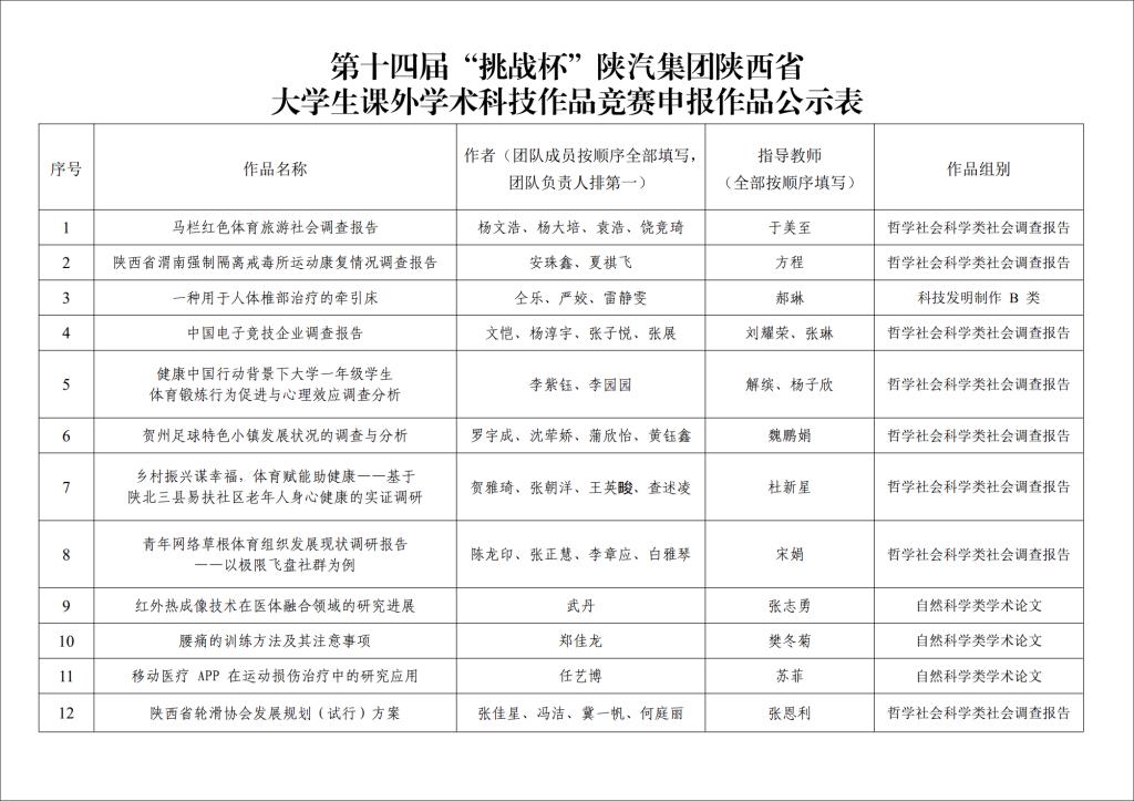 第十四届“挑战杯”陕汽集团陕西省大学生课外学术科技作品竞赛申报作品公示表