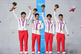10月4日举行的男子攀岩团体速度接力决赛中与队友击败印度尼西亚队获得冠军