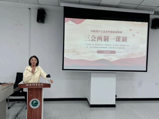 第二项,校团委综合部副部长雷云通过“学三会两制一课,提青年思想觉悟”为主题进行培训。 会上,对“三会两制一课”的具体内容进行了详细解读。“三会”包括支部大会、支部委员会和团小组会,“两制”是指团员教育评议制度和团员年度团籍注册制度,“一课”则是团课,雷云老师从各个角度深入阐述了相关含义及意义。她强调,落实“三会两制一课”是共青团保持和增强政治性、先进性、群众性的必然要求,是强化团员政治意识,提高基层组织凝聚力和战斗力的重要保障。