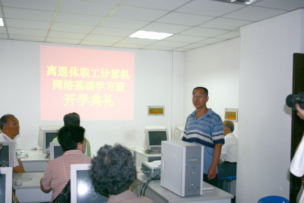 5月11日在现代教育技术与网络信息中心的学生上网机房举行了开学典礼,离退休管理办公室领导主持开幕式并宣布学习班课程安排,现代教育技术与网络信息中心主任致欢迎辞,并强调了学习中应注意的事项,指出各位来学习的老同志,应怀着愉快的心情参加学习,不要有任何负担。通过学习延缓衰老,提高沟通能力,拓宽沟通渠道。在学习中特别要注意劳逸结合,注意休息,健康而快乐的掌握计算机网络知识。王恒北随后代表老同志讲话。