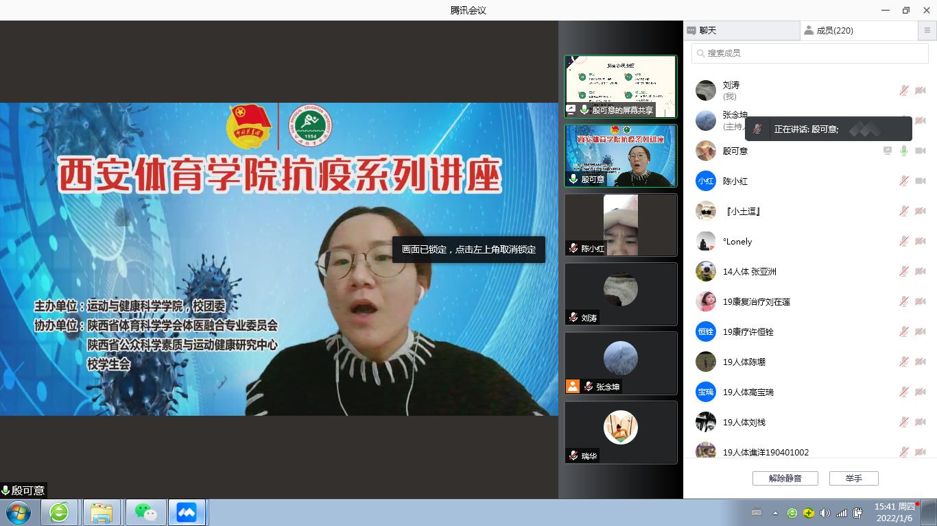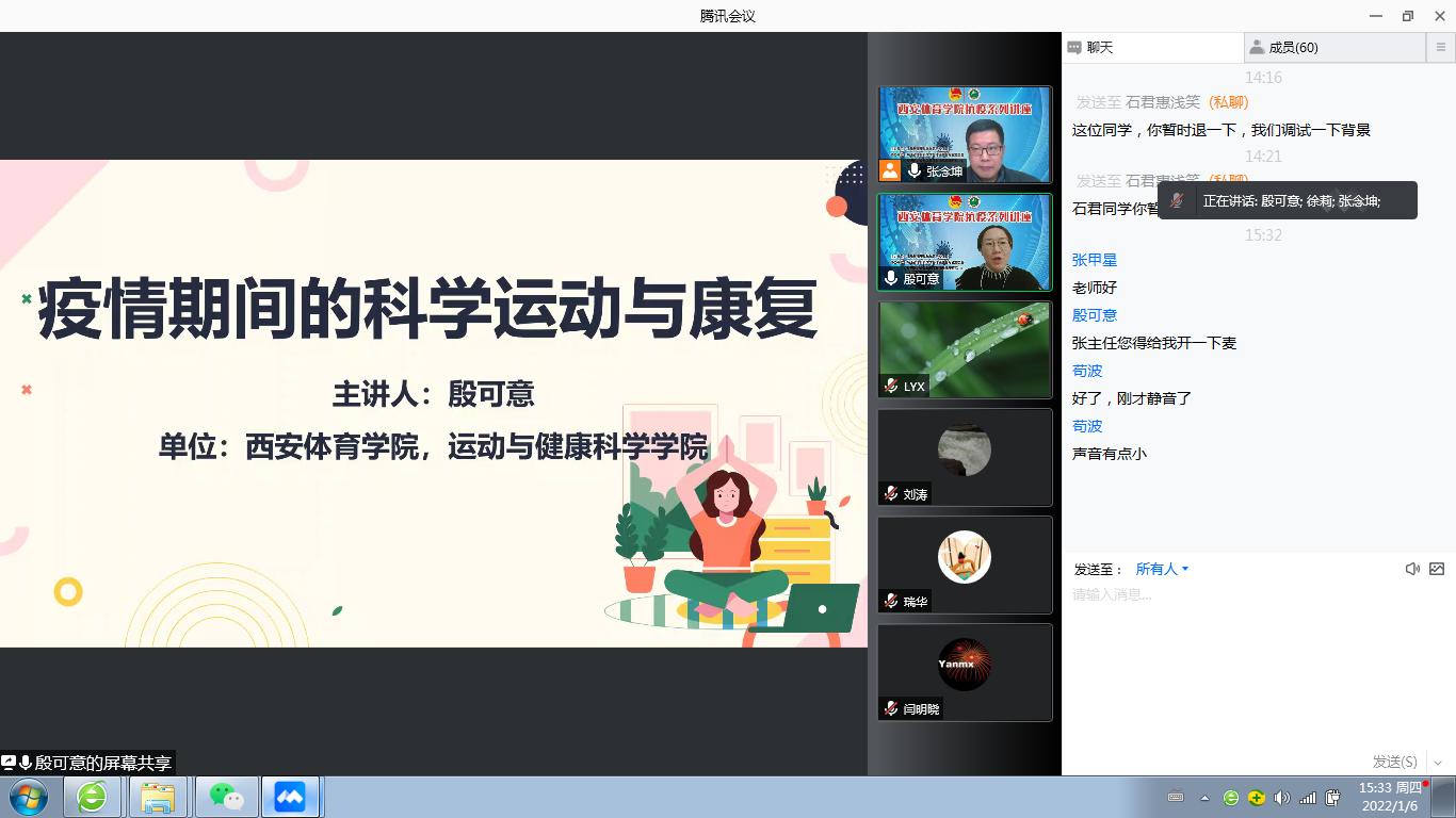 2022年1月6日 下午15:30-17:00支部党员殷可意同志主讲了“疫情期间的科学运动与康复”线上讲座,这是久久不卡区抗疫系列讲座之一。