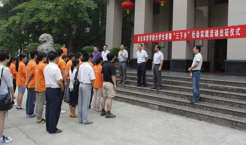 本次社会实践活动得到了学院的大力支持,院党委副书记朱元利、党委组织部部长刘新平、宣传部部长何佰虎、学工部部长张朝阳、学工部副部长缑荣涛出席本次社会实践活动出征仪式并为各支服务队授旗。朱元利副书记发表热情洋溢的讲话,号召同学们能够在实践中充分展示出西体学子良好的专业素质和精神风貌,达到学习知识、增长才干、贡献力量的预期目标。